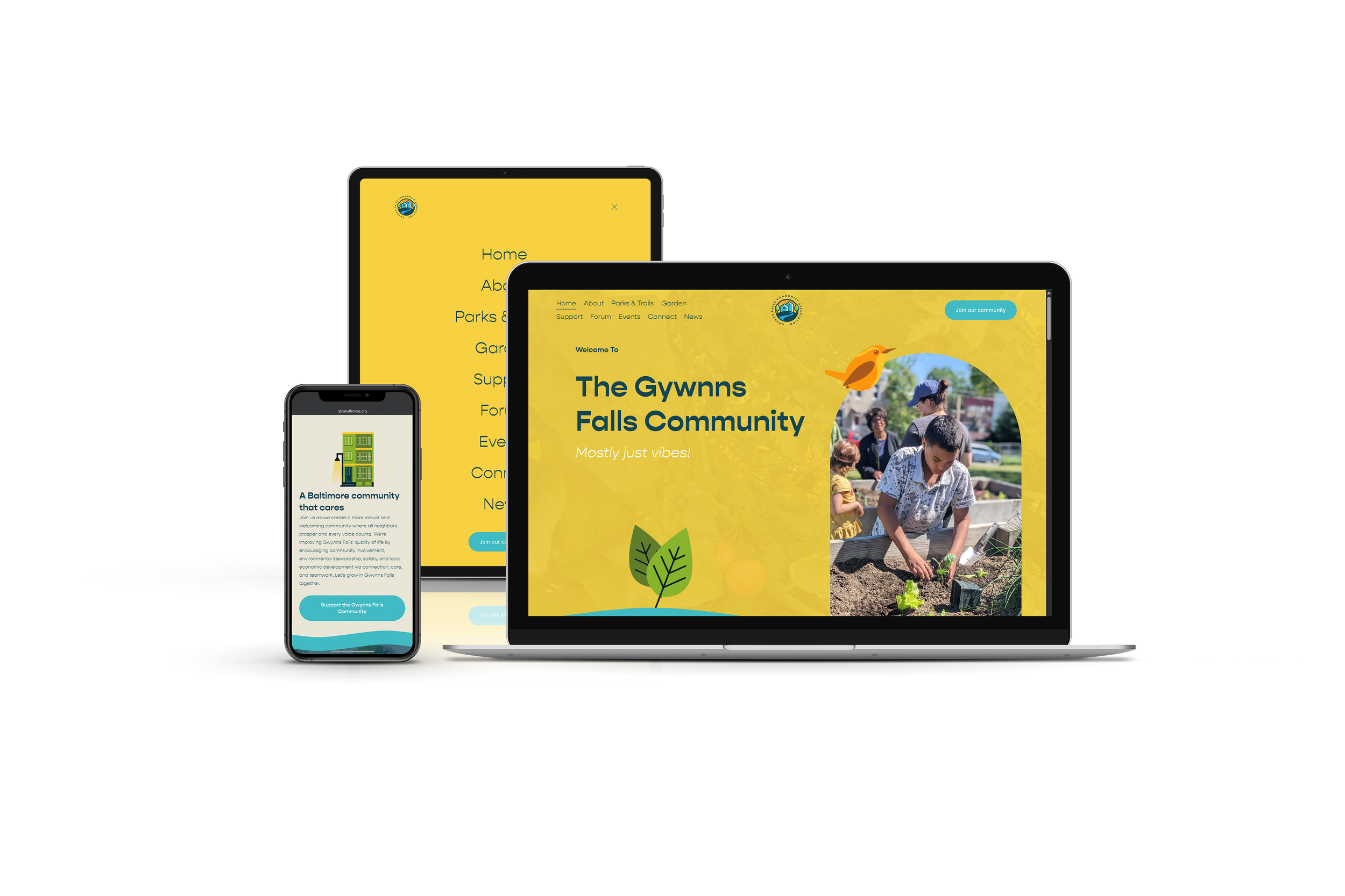 For this website design, I oversaw the creative direction for the Gwynns Falls Community Association (GFCA) website, guiding the overall vision, structure, and digital experience for the project. The goal was to create a site that felt approachable, community-centered, and easy to use—something that reflected the association’s commitment to local engagement and neighborhood stewardship.